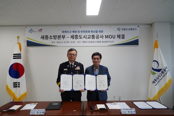 [금요저널] 세종소방본부가 세종도시교통공사와 지난 24일 대평동 첨단비알티차고지에서 안전문화 확산을 위한 업무협약을 체결했다.