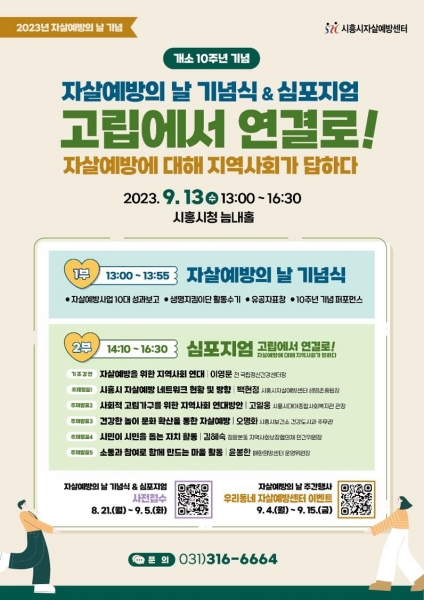 [금요저널] 시흥시자살예방센터는 ‘자살 예방의 날’과 센터 개소 10주년을 기념하고자 9월 13일 시청 늠내홀에서 ‘자살 예방의 날’ 기념식과 심포지엄을 진행한다.