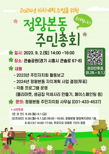 [금요저널] 정왕본동 주민자치회가 오는 9월 2일 오후 2시부터 오후 4시까지 큰솔공원에서 ‘2023년 정왕본동 주민총회’를 개최한다.