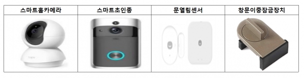 안심홈세트는 여성 1인 가구의 안전한 주거생활을 위해 지원하는 보안용품으로 본인의 집 내·외부를 휴대전화로 확인할 수 있는 스마트홈카메라와 스마트초인종, 문열림센서 창문이중잠금장치 등 총 4종으로 구성된다.