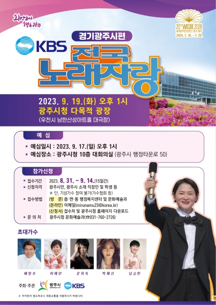 시 관계자는 “광주시민의 날을 기념해 열리는 전국노래자랑에 넘치는 끼와 재능을 가진 많은 시민들의 참여를 바란다”고 말했다.
