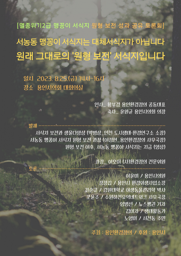 좌장을 맡은 환경정의 이오이 전문위원은 “용인시 서농동의 원형 보전 맹꽁이 서식지는 대체서식지가 아닌 원형 보전의 좋은 사례로 보전과정에서 시민단체, 전문가, 행정, 시민 등 다양한 주체들이 각각의 영역에서 제 역할을 훌륭하게 해낸 덕분에 만들어진 사례”고 강조하면서 “이것을 꾸준히 지속해 용인을 넘어 대한민국의 생물다양성 측면에서 더 많은 사례를 낳고 그것이 기후위기 시대 적응의 성과로 나타날 수 있기를 바란다”고 정리했다.