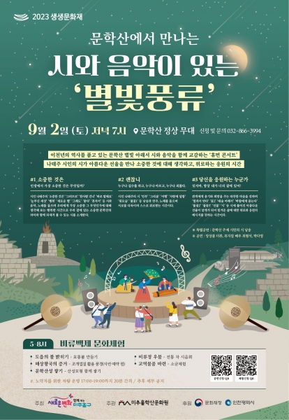 한편 ‘시와 음악이 있는 별빛풍류’는 2023년 생생문화재 사업의 일환으로 진행되며 미추홀구청이 주최하고 미추홀학산문화원이 주관하며 문화재청, 인천광역시가 후원한다.