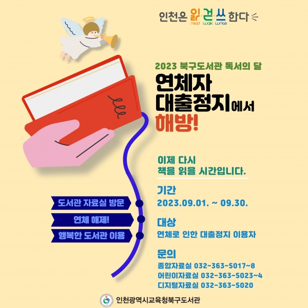 [금요저널] 인천광역시교육청북구도서관은 독서의 달을 맞아 9월 한 달 동안 자료 반납 연체자에 대해 대출 정지 해제 행사를 시행한다고 29일 밝혔다.