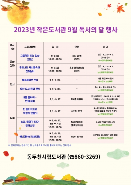 [금요저널] 동두천시 평생교육원 시립도서관에서는 오는 9월 한 달간 독서의 달을 맞이해 어수정 작은도서관과 남산모루 작은도서관에서 지역 주민을 대상으로 다양한 행사를 운영한다고 밝혔다.