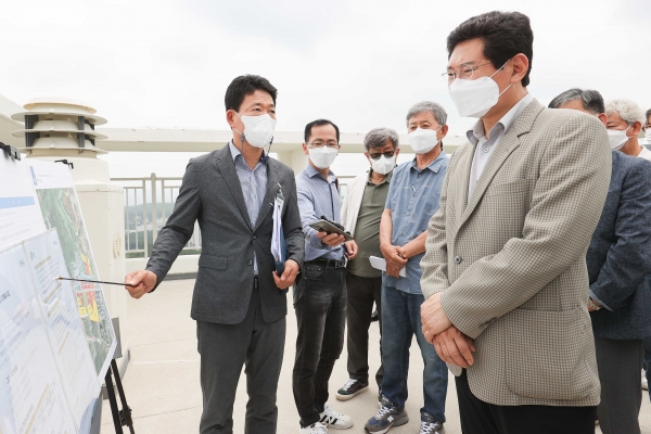 이 시장은 아파트 옥상에 올라 대체도로가 들어설 부지를 점검하며 “지난해 7월 취임한 뒤 아파트 입주희망자들이 많이 기다려온 점을 염두에 두고 입주의 선결조건인 도로개설 문제 해결에 주력했다"면서 "인근 역삼지구 개발과 연동된 기존의 진출입로 개설은 무망한 만큼 대체도로 개설이란 해법이 마련됐으니 도로가 내년 말까지 뚫릴 수 있도록 속도를 다음달라”고 주문했다.