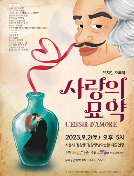 [금요저널] 시흥시가 주최하고 시흥오페라단이 주관하는 뮤지컬 오페라 공연 ‘사랑의 묘약’이 오는 9월 2일 오후 5시에 정왕평생학습관에서 열린다.