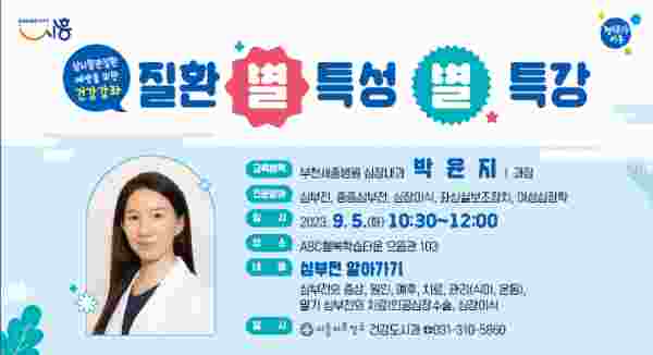 9월 5일 오전 10시 30분부터 12시까지 부천세종병원 박윤지 심장내과장이 ‘심부전 알아가기’란 주제로 심부전의 증상, 원인, 예후, 치료, 관리에 관한 강의를 펼친다.
