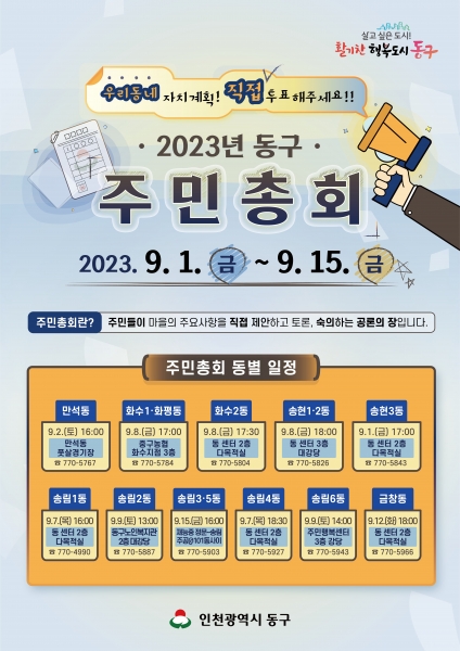 주민총회는 9월 1일 송현3동을 시작으로 15일까지 11개 동 주민자치회 주관으로 진행된다.