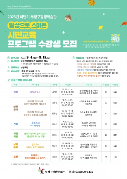 프로그램은 인문학적 소양 함양을 위한 ‘낭독과 필사’ 디지털 리터러시 기초과정인 ‘초간단 영상제작’ 디지털 리터러시 심화과정인 ‘영상제작 스킬업’ 자가진단 건강체크 ‘통증관리, 바디테라피’ 나와 나를 둘러싼 공동체에서 시민성 향상을 위한 ‘선배시민이라 불러다오~ 나를 찾아 떠나는 여행’ 생활공간 관리 테크닉을 배우며 소소한 일상의 여유를 되찾는 시간 ‘탐나는 셀프인테리어’ ‘티클래스, 차의 이해와 다도 즐기기’ 등 7개의 강좌로 운영된다.