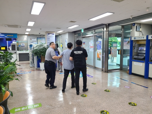 실제상황을 가정해 진행한 이번 훈련은 흉기를 이용한 민원인의 위협 발생, 민원인 진정 유도, 경찰 또는 보안업체 안전요원 호출 및 청원경찰 도움 요청, 피해공무원 격리와 방문 민원인 대피, 민원인 제압 후 인계의 순서로 이뤄졌다.