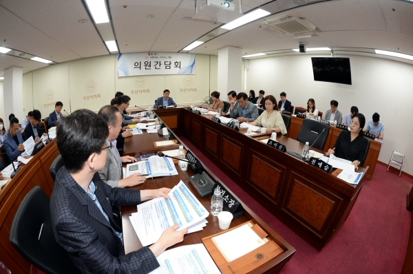 이날 간담회에서는 제35회 오산시민의 날 기념 경축 행사 오산시사회복지시설 조직진단 연구용역 현황 오산 궐동 도시재생활성화계획변경 동부대로 연속화 및 확장공사 오산시 정신건강복지센터 운영 민간위탁 동의안 생활자원회수시설 건립 진행 상황 보고 오산시시설관리공단 조직변경 동의안 오산도시공사설립 및 운영조례 제정 2023년 제3회 추가경정예산 편성계획 등 총 46건에 대해 집행부 국·소장 등 관계 공무원으로부터 사업 설명을 청취하고 폭넓은 의견을 교환했다.
