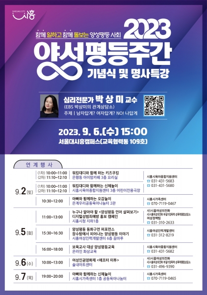 먼저 오는 9월 6일 오후 3시에는 서울대학교 시흥캠퍼스에서 2023년 양성평등주간 기념식을 개최한다.