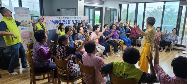 [금요저널] 이천시 장호원읍지역사회보장협의체는 30일 장호원읍 풍계3리 마을회관에서 ‘희망의 장호원 정신건강 사업” 어르신 치매 예방을 위해 지난번 반려식물 꾸미기에 이어 웃음치료 프로그램을 진행했다.