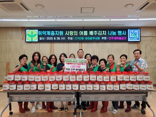 이번 배추김치 나눔행사는 인주새마을금고가 100만원을 후원해 간석2동 새마을부녀회와 함께 장애인, 한부모 가정, 홀몸 어르신 등 취약계층의 건강한 여름나기를 돕기 위해 마련됐다.