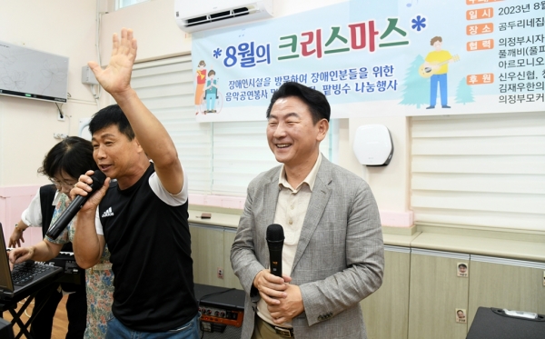 [금요저널] 의정부시는 8월 29일 의정부나눔축구봉사단 주최로 의정부 장애인주간·단기보호시설 곰두리네집에서 음악 공연과 선물 나눔 봉사를 진행했다고 밝혔다.