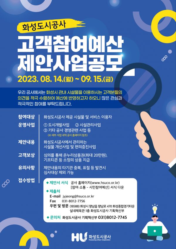 2023년 고객참여예산 사업 접수는 오는 9월 15일까지 진행되며 HU공사 홈페이지를 통해 서식을 내려받아 제출할 수 있으며 우편 및 팩스, 방문 접수도 가능하다.
