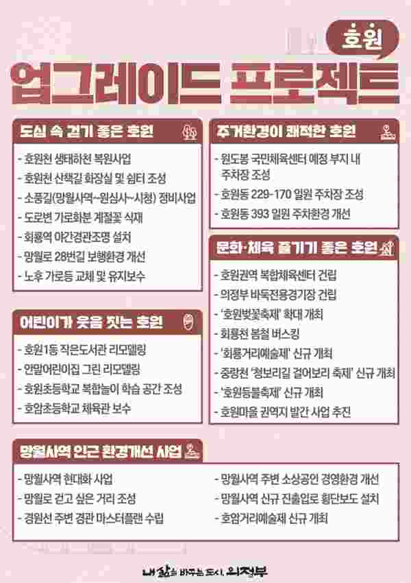 시는 도심 속 걷기 좋은 호원 어린이가 웃음 짓는 호원 주거환경이 쾌적한 호원 문화·체육을 즐기기 좋은 호원 망월사역 인근 환경개선 등을 목표로 28개의 세부사업을 추진해 나갈 계획이다.