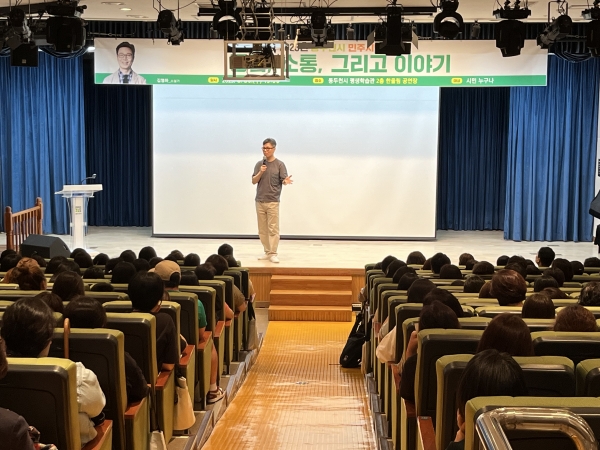 이번 강연은 tvN‘알쓸신잡’ 외 다수 프로그램에 출연하며 ‘살인자의 기억법’, ‘작별 인사’ 등을 저술한 김영하 작가가 초빙돼 ‘공감, 소통, 그리고 이야기’를 주제로 진행해 호응을 얻었다.