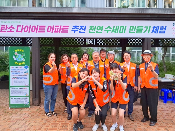 이날 행사에는 아파트 주민봉사단 17명이 참여해 일회용품 사용 줄이기, 기후 위기와 에너지 절약, 쓰레기 분리배출 올바로 하기 등 탄소중립 실천을 홍보하고 친환경 수세미 꾸미기 체험활동을 진행했다.