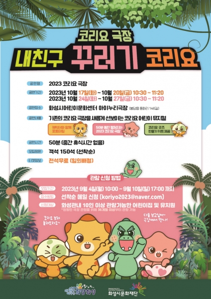 [금요저널] 화성시문화재단은 9월 4일부터 10일까지 ‘2023 코리요 극장’ 10월 공연의 관람단체를 모집한다.