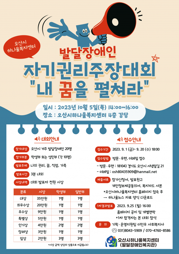 [금요저널] 오산시하나울복지센터는 9월 20일까지 3주간 발달장애인을 대상으로 ‘자기 권리 주장대회’ 참가자를 모집한다.