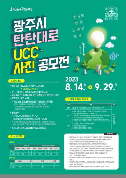 이번 공모전은 ‘광주시 탄탄대로’란 주제로 광주시의 지역 특수성 및 상징성을 반영한 생활 속 탄소중립 실천 방안에 대해 UCC 또는 사진으로 제출하면 된다.