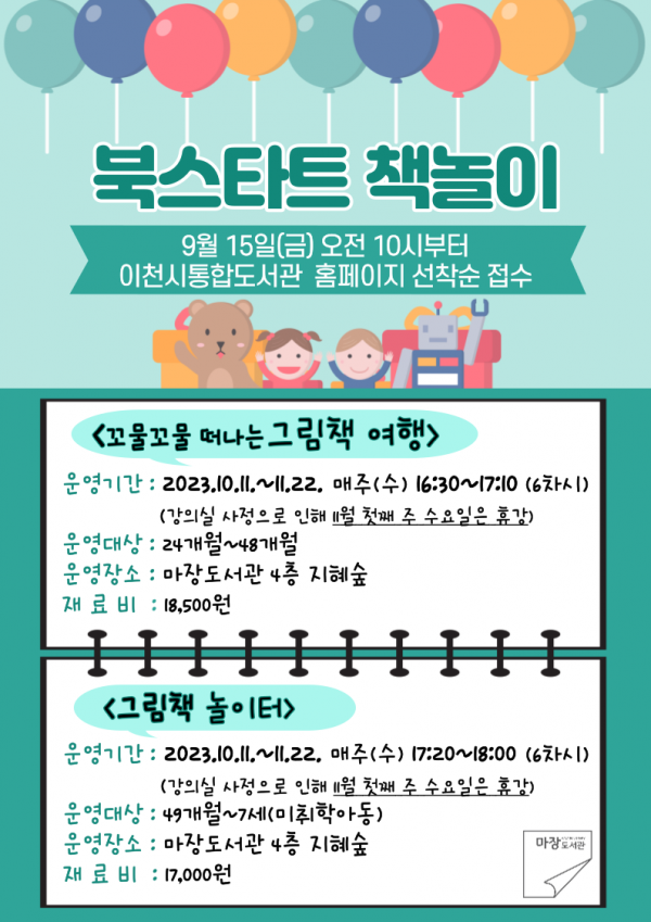 [금요저널] 이천시 마장도서관은 오는 10월 11일부터 관내 거주 유아를 대상으로 ‘북스타트 책놀이터’ 프로그램을 운영한다.