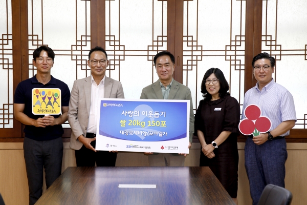 [금요저널] 지난 5일 평택시청 대외협력실에서 정장선 평택시장, 대광로제비앙 김병채 상무, 모아엘가 임태성 과장, 홍성녀 시 복지정책과장, 평택행복나눔본부 황성식 나눔국장 등이 참석한 가운데 백미 20㎏ 150포 전달식을 진행했다.