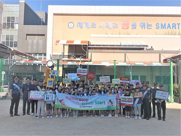 [금요저널] 세종남부경찰서는 7일 08:00 세종시 참샘초등학교에서‘2023년 2학기 아동·청소년 안전확보 집중활동 계획’의 일환으로‘학교폭력 및 소년범죄 예방 합동 캠페인’을 전개했다.