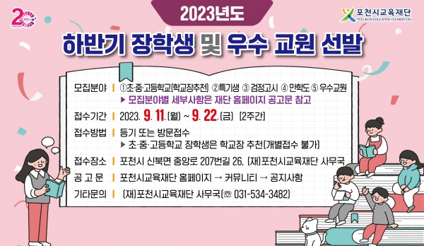 [금요저널] 포천시교육재단은 다양한 분야의 인재 육성 및 발굴을 위해 ‘2023년 하반기 장학생 및 우수교원’을 선발한다고 밝혔다.