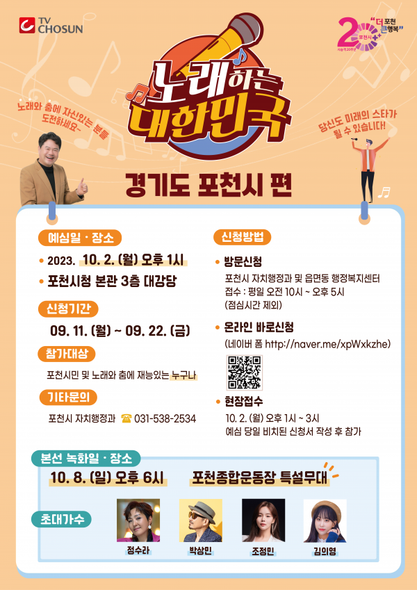 [금요저널] 포천시는 오는 11일부터 22일까지 ‘TV조선 노래하는 대한민국, 포천시편’ 예심 참가 시민을 공개 모집한다.