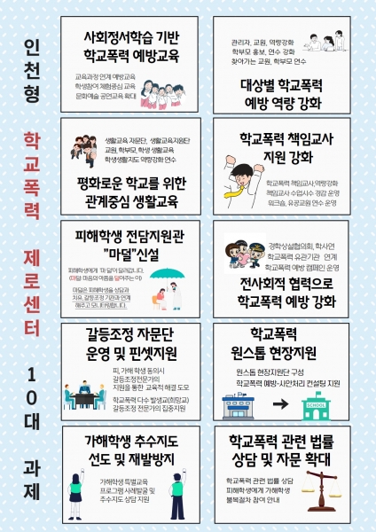 인천시교육청은 인천형 학교폭력 제로센터 시범 모델을 구축하기 위해 사회정서학습 기반 학교폭력 예방교육 대상별 학교폭력 예방 역량 강화 평화로운 학교를 위한 관계중심 생활교육 학교폭력 책임교사 지원 강화 전 사회적 협력으로 학교폭력 예방 강화 피해학생 전담지원관 신설 갈등조정 자문단 운영 및 핀셋지원 학교폭력 원스톱 현장지원 가해학생 추수지도 선도 및 재발방지 학교폭력 관련 법률 상담 및 자문 확대 등 10대 과제를 제시했다.