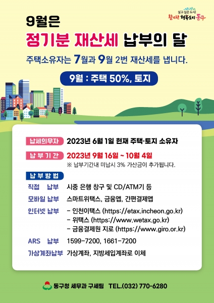 이번 9월분 재산세 부과대상은 매년 6월 1일 현재 동구에 소재한 주택, 토지를 소유한 자에게 부과하는 것으로 주택은 연세액을 7월과 9월에 50%씩 나누어 고지되고 주택 부속토지 외 관내 소유 토지는 9월에 전액 고지된다.