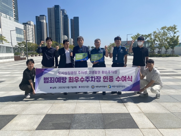 [금요저널] 세종남부경찰서는 2023년 9월 7일 10:00 세종시 나성동 840 도시상징광장, 나성동 환승주차장에서 세종특별자치시 시설관리공단관계자들이 참여한 가운데 ‘범죄예방 최우수시설 인증패 전달식’을 가졌다.