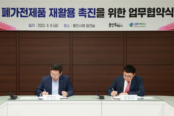 용인특례시는 8일 이상일 시장이 접견실에서 폐가전제품 수집·운반기관인 E-순환거버넌스 정덕기 이사장과 폐가전 배출·수거 및 재활용 촉진을 위한 업무협약을 체결했다고 밝혔다.