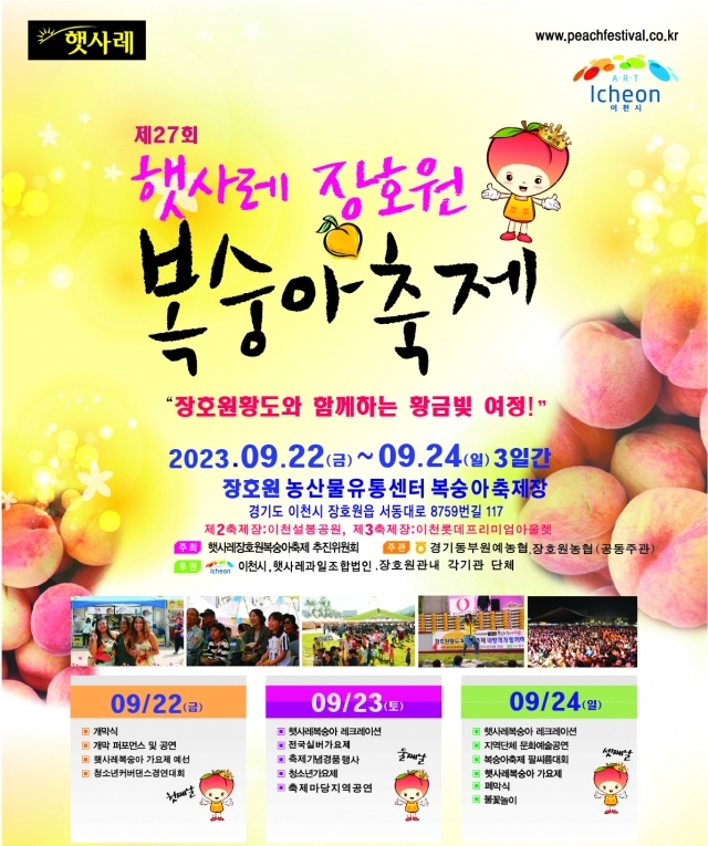 이천시는 22~24일 장호원 햇사레 농산물산지유통센터 복숭아축제장에서 ‘장호원황도와 함께하는 황금빛 여정’을 주제로 제27회 햇사레 장호원복숭아축제를 연다.