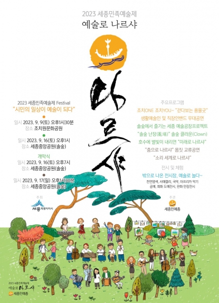 오는 16일 오후 7시 세종중앙공원 솔숲무대에서 ‘호수에 별빛이 내리면 미래로 나르샤’라는 주제의 개막식이 열려 ‘2023 세종민족예술제’의 본격적인 출발을 알린다.