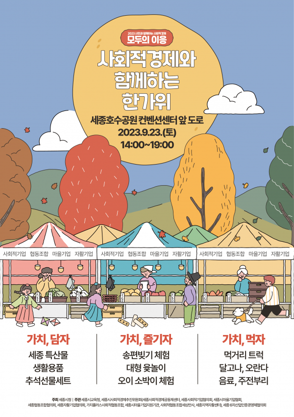 [금요저널] 세종특별자치시가 주최하고 세종시사회적경제추진위원회가 주관하는 사회적경제 ‘모두의 이응’ 행사가 민족의 대명절 추석을 앞두고 오는 23일 세종컨벤션센터 앞 도로에서 열린다.