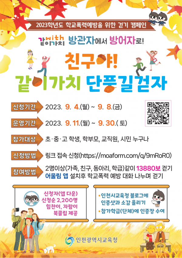 [금요저널] 인천광역시교육청은 30일까지 시민과 함께하는 학교폭력 예방 읽걷쓰 ‘같이가치 단풍길걷자’ 캠페인을 운영한다.