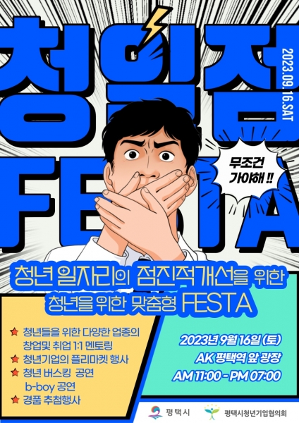 이번 행사는 ‘2023년 평택시 청년정책 공모사업’에서 선정된 보조사업의 하나로 청년 창업 및 취업 1:1 멘토링, 청년 기업의 사업 분야별 전시 부스 운영, 다양한 청년 거리 공연 및 경품 추첨 등 다양한 프로그램이 진행될 예정이다.