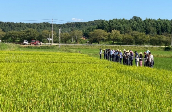 [금요저널] 여주시는 지역 농업환경과 여주시 대왕님표여주쌀의 브랜드 가치 보존을 위해 진행되는 수요자 참여형 육종프로그램의 농촌진흥청의 전문가 주관 포장생육 계통 중간 평가를 9월 7일 여주시 하거동 138 일대에 지역적응시험포장에서 진행했다.