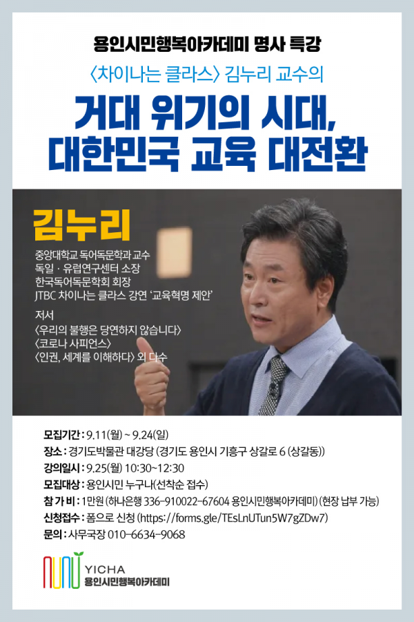 [금요저널] 용인시민행복아카데미는 ‘용인시민을 행복하게’라는 주제로 오는 25일 오전 10시 30분부터 정원영 전 용인시정연구원장의 사회로 김누리 교수 초청 ‘명사 특강’을 경기도박물관 대강당에서 개최한다.