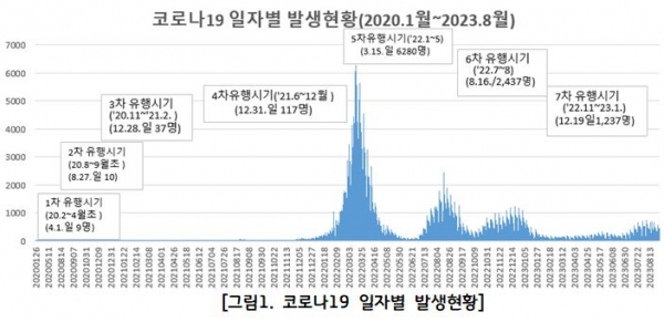 연도별로는 2020년 541명, 2021년 7,284명, 2022년 33만 1,604명, 2023년 5만 9,291명이 확진됐고 특히 오미크론 대유행이 시작된 2022년에는 총확진자의 83.2%가 발생했다.