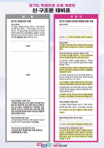 [금요저널] 경기도교육청이 경기도 학생인권 조례를 ‘경기도 학생의 권리와 책임에 관한 조례’로 개정안을 확정하고 도의회 제출을 준비 중이다.