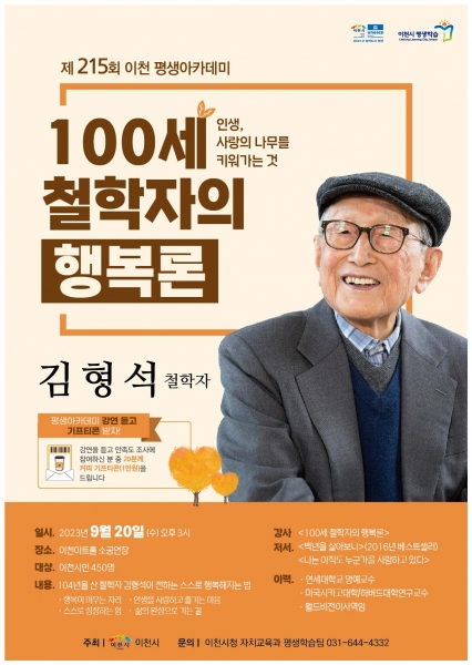 [금요저널] 이천시는 이번 달 20일 오후 3시 이천아트홀 소공연장에서 철학자 김형석 교수를 초청해 100세 철학자의 행복론을 주제로‘제215회 이천 평생아카데미’를 개최한다.