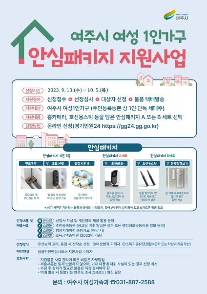지원 물품은 기본 3종과 홈카메라 또는 호신용스틱/문열림경보기로 구성된 세트로 오는 13일부터 10월 5일까지 경기민원24를 통해 신청할 수 있으며 자세한 사항은 여주시청 홈페이지 공고에서 확인할 수 있다.