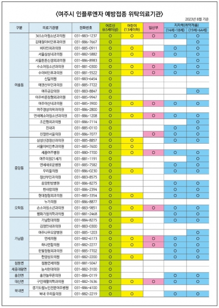또 여주시민 중 14~64세 기초생활수급자, 차상위계층, 장애인, 국가유공자를 대상으로 오는 10. 23.부터 12. 20.까지 무료 접종을 관내 지정의료기관 35개소에서 실시할 예정이다.