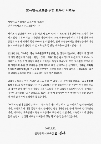 [금요저널] 도성훈 인천광역시교육감은 12일 ‘교육활동보호를 위한 교육감 서한문’을 통해 교육감 직속 교육활동보호담당관 신설 등이 담긴 교권보호 대책을 발표했다.