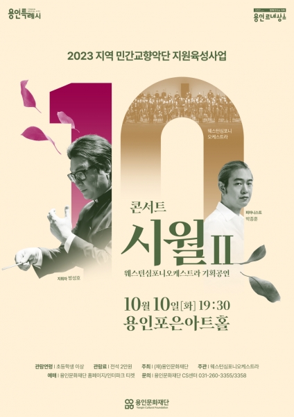 [금요저널] 용인문화재단은 오는 10월 10일 용인포은아트홀에서 웨스턴심포니오케스트라 기획공연 ‘콘서트 시월 Ⅱ’를 개최한다고 밝혔다.